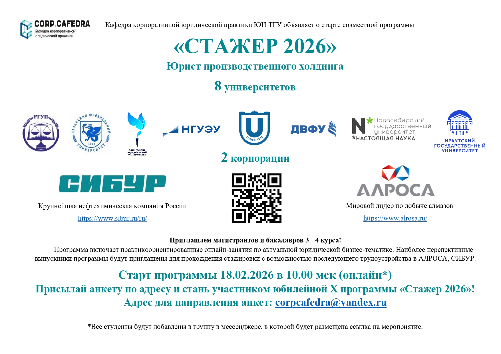 Студентам, желающим принять участие в программе, необходимо прислать анкету по адресу corpcafedra@yandex.ru до 17 февраля 2026 года.